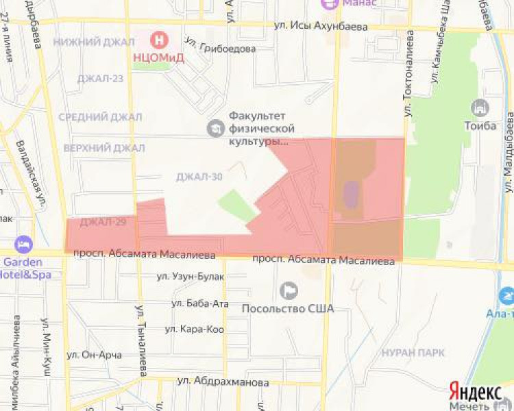 Зона отключения ограничена: ул. Токтоналиева – Гшлиессера – пр. А. Масалиева – ул. Минжилкиева – Т. Сагындыкова.
