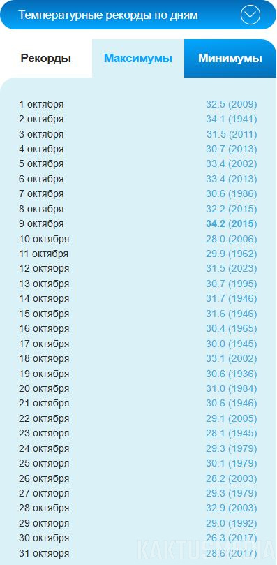 Архивные данные многолетних наблюдений содержатся на российском сайте погоды pogodaiklimat.ru. Посмотрим, какие температурные рекорды погоды были в Бишкеке в прошлые годы в октябре.