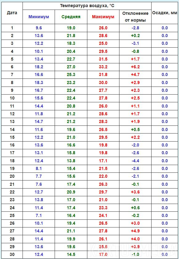 Норма суммы осадков в сентябре 18 мм, осадков не было. Эта сумма составляет 0% от нормы.