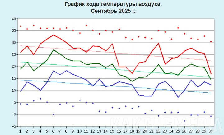 Норма среднемесячной температуры сентября +18,7 °C. Фактическая температура сентября 2025 года составила +19,6 °C. Отклонение от нормы составило +0,9 °C.