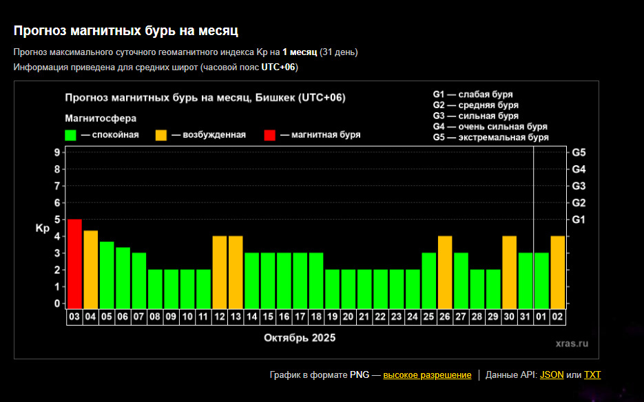 В начале месяца геомагнитная буря находится в диапазоне G1-G3, большую часть времени оставаясь на среднем уровне, но с отдельными сильными всплесками.