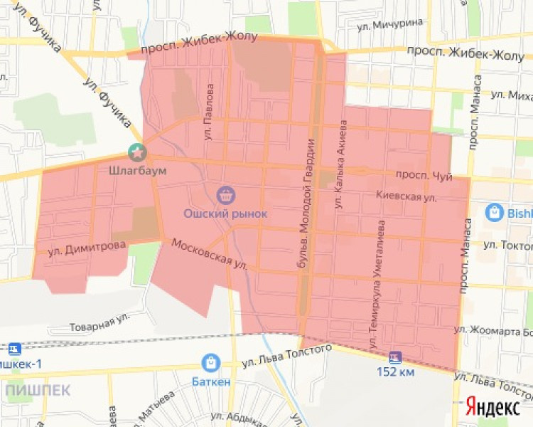 от пр. Манаса - линия железной дороги до реки Ала-Арча, по реке Ала-Арча до ул. Боконбаева / ул. Кулиева, по ул. Кулиева до ул. Московской, по ул. Московской до ул. Дмитрова, далее по ул. Орозова до ул. Казакова, по ул. Казакова до пр. Д. Сяопина, до реки Ала-Арча, по реке Ала-Арча до пр. Жибек Жолу, по пр. Жибек Жолу до бул. Молодой Гвардии, до ул. М. Фрунзе, по ул. М. Фрунзе до ул. Турусбекова, по ул. Турусбекова до пр. Чуй, по пр. Чуй до пр. Манаса, по пр. Манаса до линии железной дороги.
