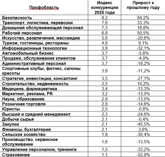 Конкуренция за рабочие места выросла в большинстве регионов и отраслей. Особенно высокие показатели в сферах безопасности, транспорта, логистики, перевозки и домашнего обслуживающего персонала.