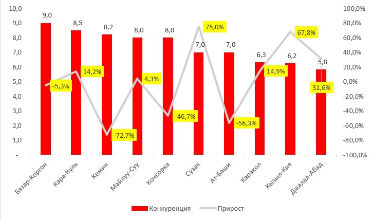 В то же время в Кара-Балте отмечено небольшое снижение на –10%, тогда как в других регионах активность соискателей сохраняется на положительном уровне.
