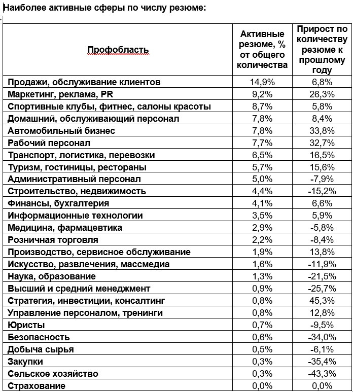 Особенно активно резюме размещают представители продажи, маркетинга, рекламы, PR, сферы обслуживания и домашнего персонала, что отражает спрос на рабочие места в данных отраслях.