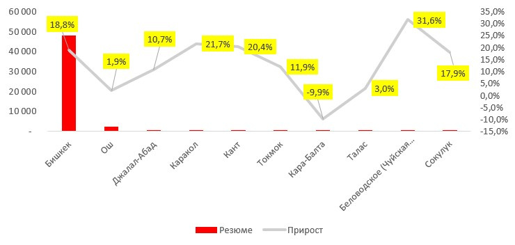 Среди других городов положительная динамика отмечается в Караколе (0,9%, прирост 22%), Канте (0,7%, прирост 20%) и Токмоке (0,7%, прирост 12%). Наибольший рост зафиксирован в Беловодском (0,3%, прирост 32%) и Сокулуке (0,3%, прирост 18%), что указывает на постепенное расширение географии поиска работы за пределами столицы.