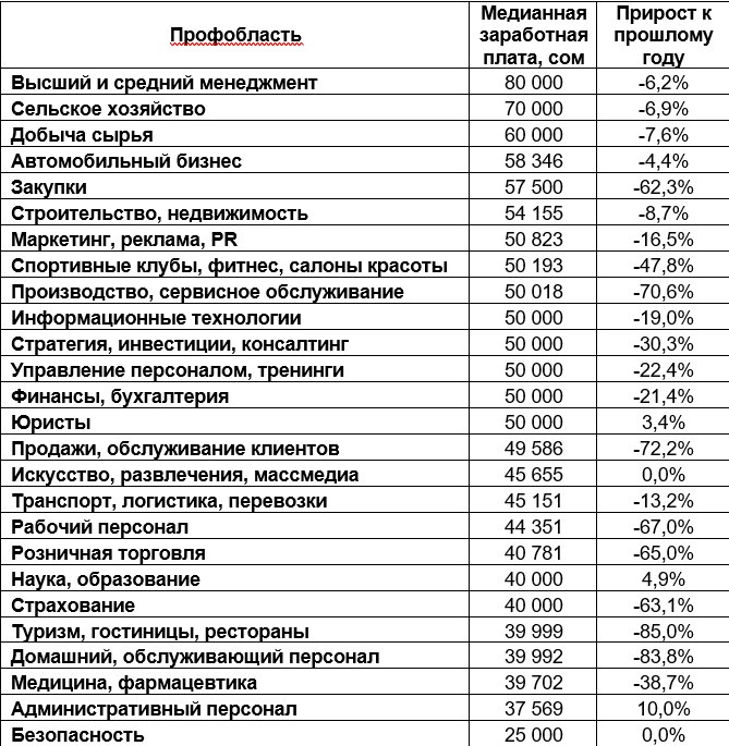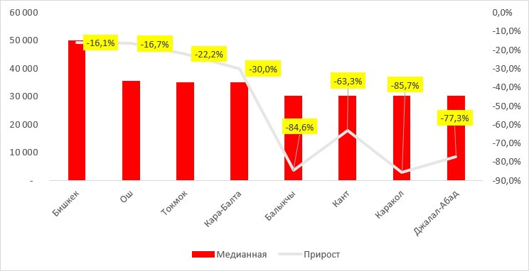Медианная предлагаемая заработная плата по Кыргызстану составила 37 284 сома, что на -19,2% меньше, чем в прошлом году. Медианная зарплата остается более объективным показателем, чем средний заработок, так как позволяет избежать искажения данных, вызванного экстремальными значениями (очень высокими или очень низкими зарплатами) и показывает именно центральное значение.