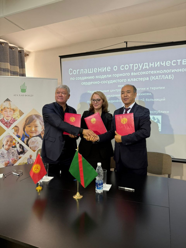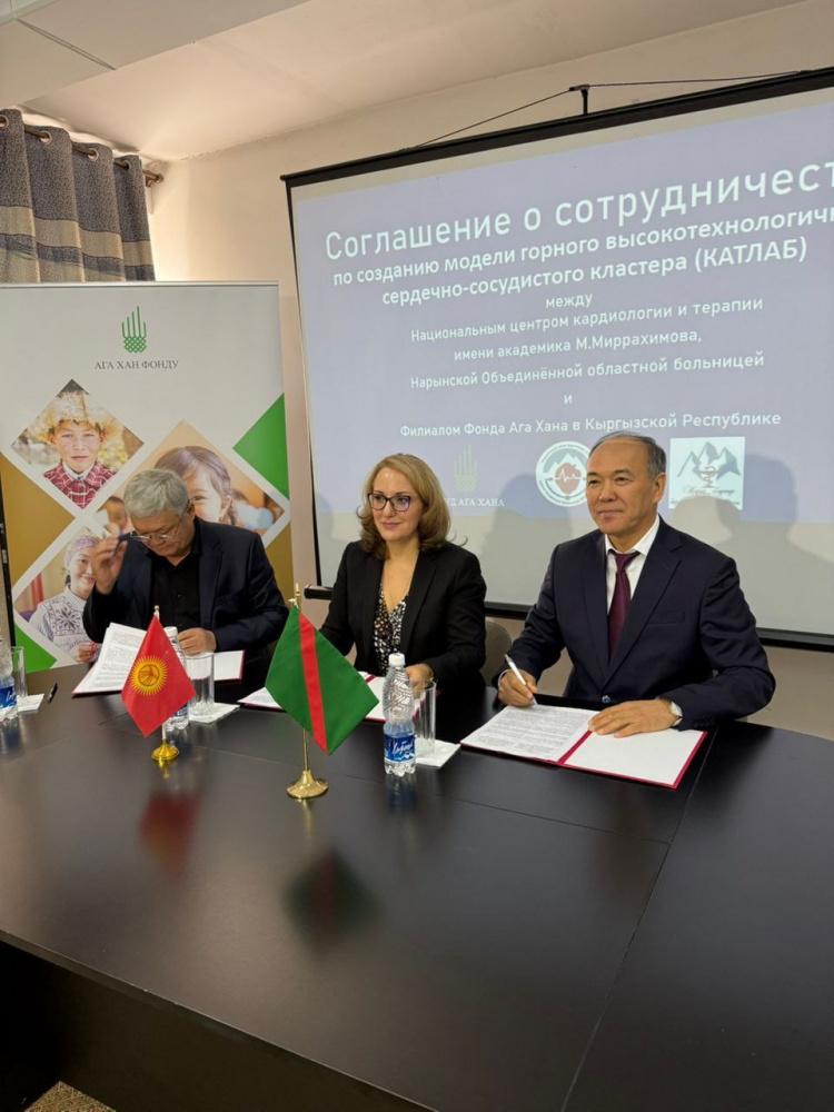 В Нарыне создадут высокотехнологичный кардиологичный центр. Сегодня, 10 октября, в Национальном центре кардиологии и терапии состоялось знаменательное событие - официальная церемония подписания Соглашения о сотрудничестве между центром, филиалом Фонда Ага Хана в Кыргызстане и Нарынской областной объединенной больницей.