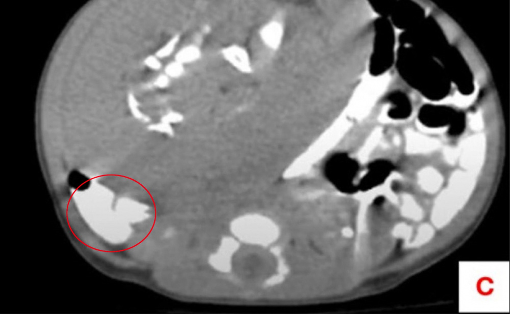 КТ с контрастированием установило, что это мягкие ткани и деформированные части скелета, похожие на длинные кости, ребра, позвонки, кости таза. Близнец-паразит получал питательные вещества от крупной артерии в теле ребенка.Его извлекли из младенца во время лапаратомии (операции, при которой совершается надрез в области брюшной полости). Капсула с телом близнеца-паразита располагалась возле печени юной пациентки. В капсуле находились жир, деформированные ткани, две конечности и пуповина. Исследование под микроскопом выявило наличие зрелой эмбриональной ткани, кожи и кишечника.