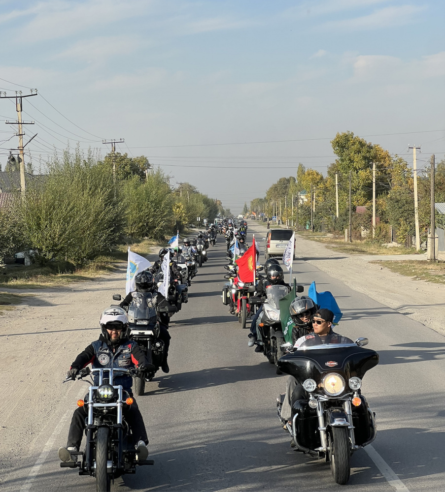 Обычно мотоциклисты колонной проезжают по главным улицам столицы. Но не в этом году. Президент мотосообщества Кыргызстана Максат Бейшенкулов рассказал, что этот пробег решили провести за городом, с учетом сложной транспортной ситуации в Бишкеке. "Одна из целей пробега - демонстрация необходимости соблюдения правил дорожного движения, взаимоуважения на дорогах, а также продвижение мотокультуры и мотоспорта. Старт колонны в сопровождении УПСМ традиционно был дан от "Перцы Паба", после чего участники направились к мемориальному комплексу "Ата-Бейит". В этот раз мы решили познакомить наших гостей с историей комплекса, являющейся неотъемлемой частью истории Кыргызстана. Заранее были организованы экскурсия по мемориалу и возложение цветов к памятнику репрессированным", - поделился Максат.