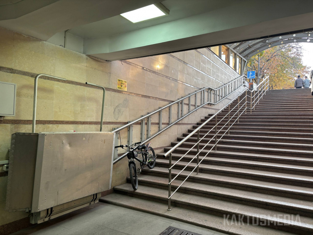 Условия для людей с инвалидностью будто бы получше - тут есть пандусы. Вот только их наклон вызывает опасения, и мало кто видел, чтобы ими пользовались люди на инвалидных колясках самостоятельно. Имеются даже электрические подъемники для таких случаев, но они не работают - некоторые и вовсе связаны проволокой. Абсолютно все они покрыты пылью. Когда-то на подъемники потратили 6,7 млн сомов. Вероятно, для видимости заботы о людях с инвалидностью и мамочек с колясками.