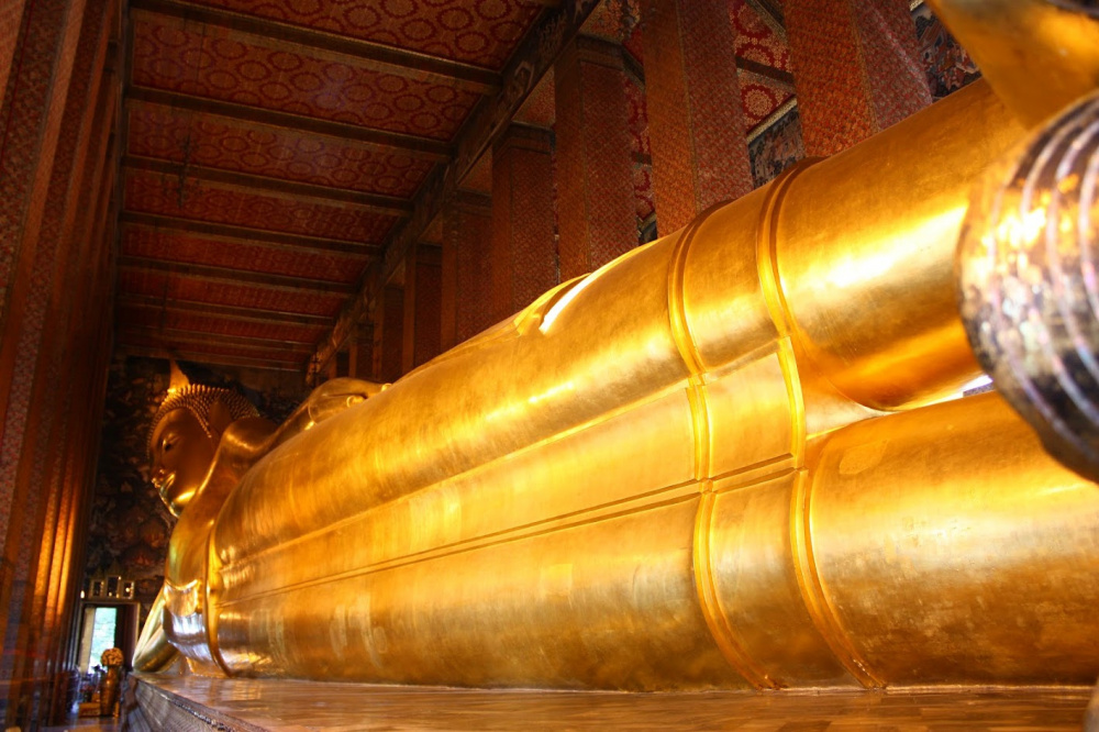 Буквально в нескольких шагах находится Храм Лежащего Будды (Ват Пхо), где вас встретит гигантская 46-метровая позолоченная фигура, ожидающая нирваны.