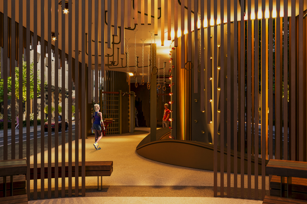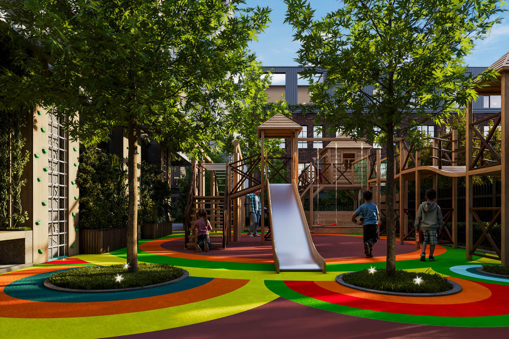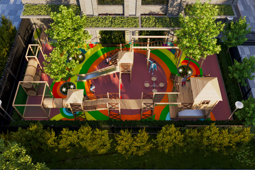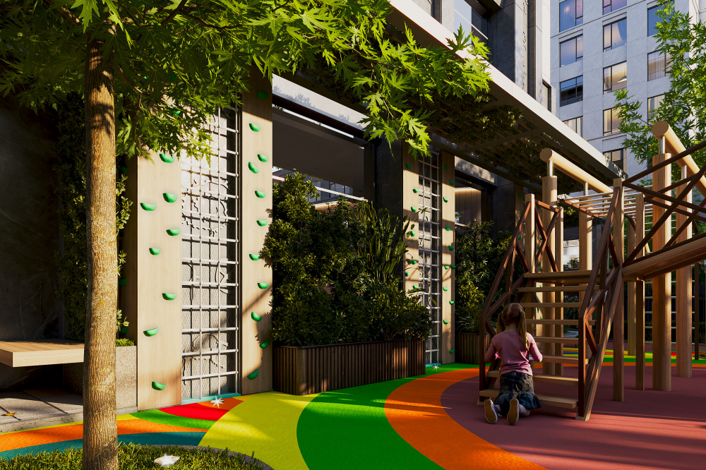 Зона двора разделена на активную часть с площадками для спорта и воркаута и зону релаксации с беседками и зелеными насаждениями. Детская площадка соответствует европейским стандартам безопасности.