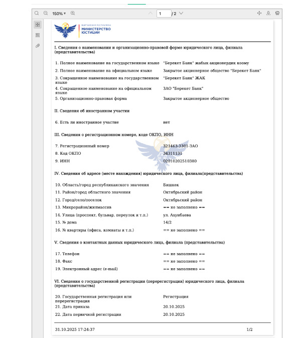 Напомним, Национальный банк КР 10 октября решил выдать лицензию на создание ЗАО "Берекет Банк". Банк был зарегистрирован в Министерстве юстиции 20 октября 2025 года, у него коммерческий характер деятельности.