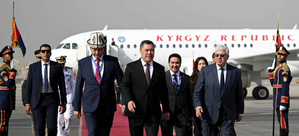 Борт главы государства приземлился в международном аэропорту Каира. Президента встретили министр высшего образования и научных исследований Египта Мохамед Айман Ашур и другие официальные лица. В аэропорту были вывешены государственные флаги Кыргызстана и Египта, расстелена ковровая дорожка и выстроена рота почетного караула.