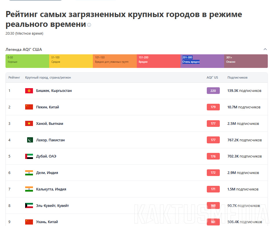 Бишкек занял первое место среди городов с самым загрязненным воздухом. Такие данные приводит сервис мониторинга качества воздуха по результатам замеров, проведенных 6 ноября.