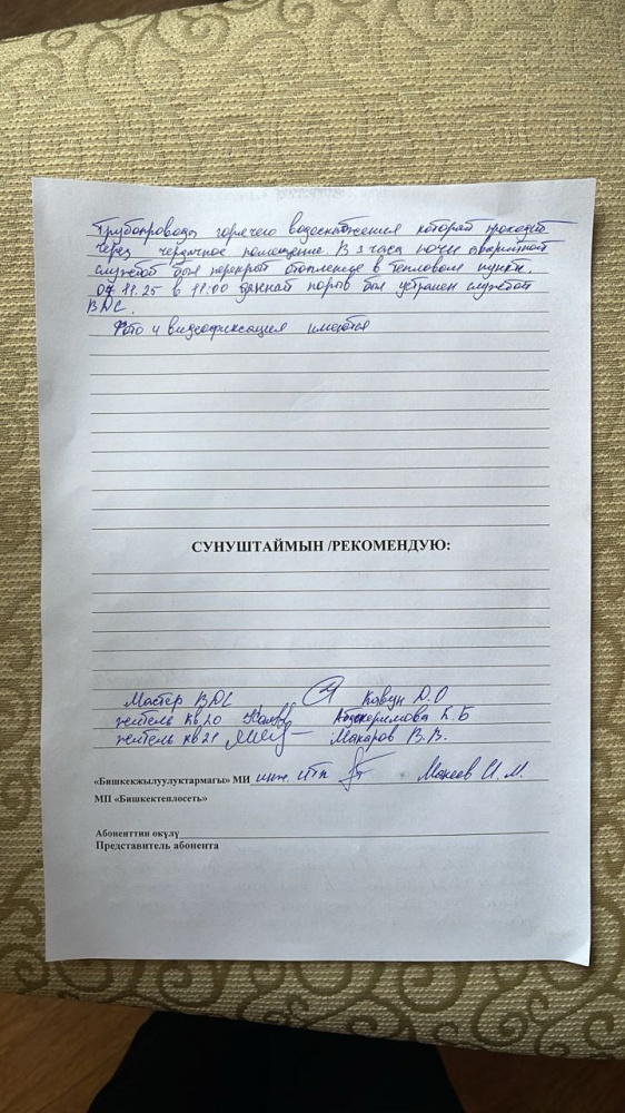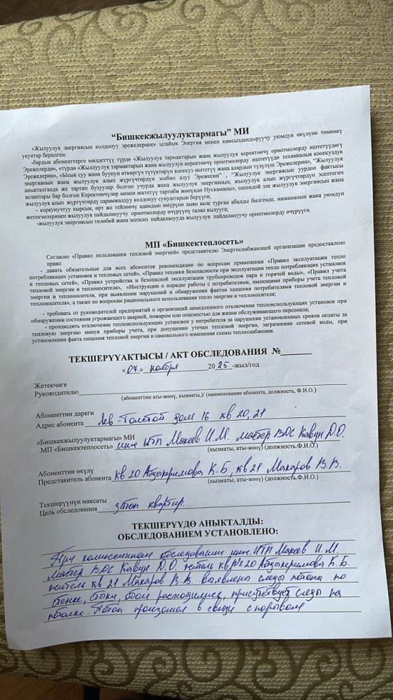 Ночью на место выехала аварийная бригада МП "Бишкектеплосеть", сотрудники предприятия составили акт о затоплении. Днем подъезд также осмотрели представители мэрии.