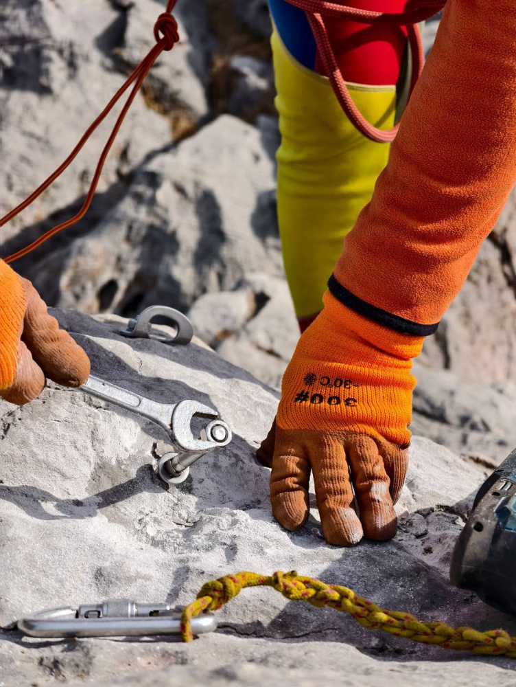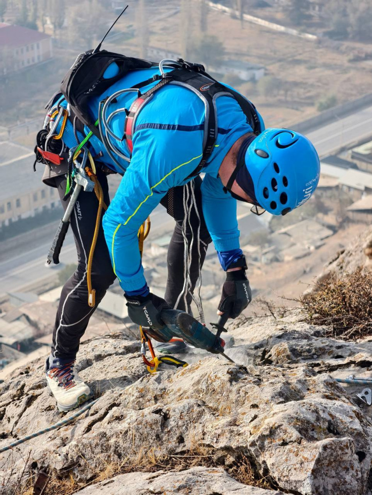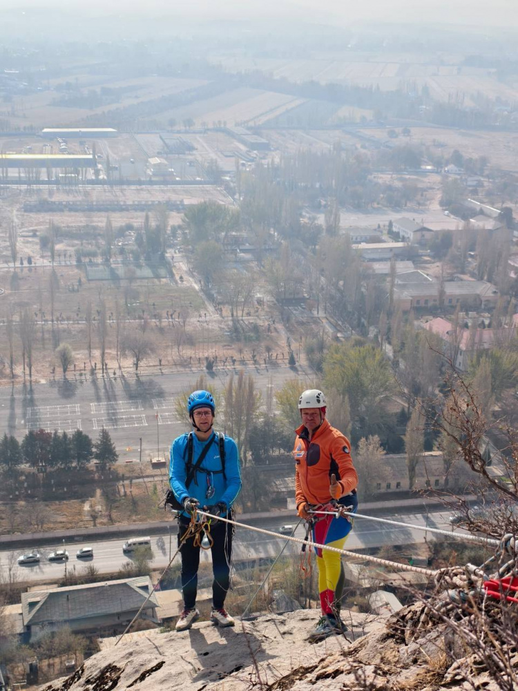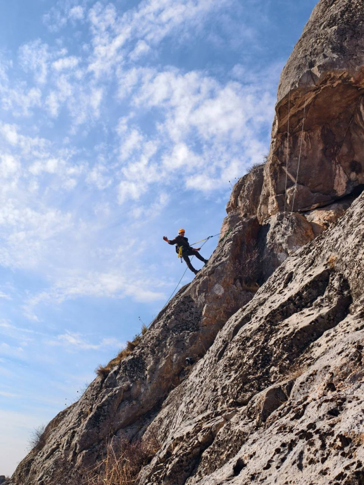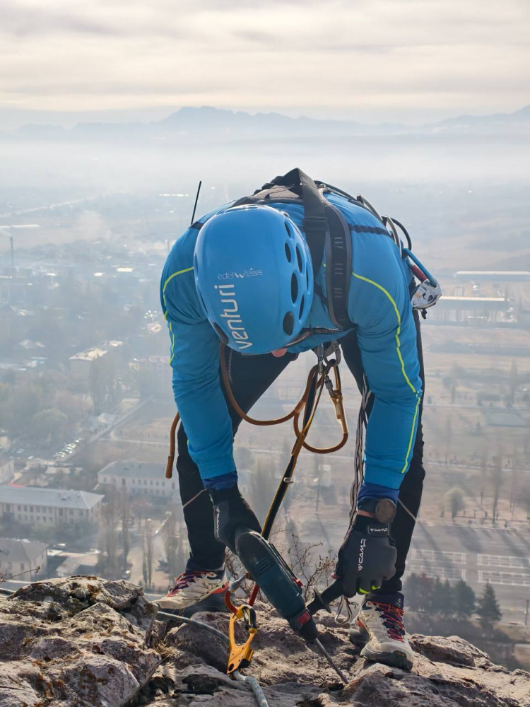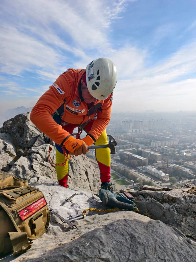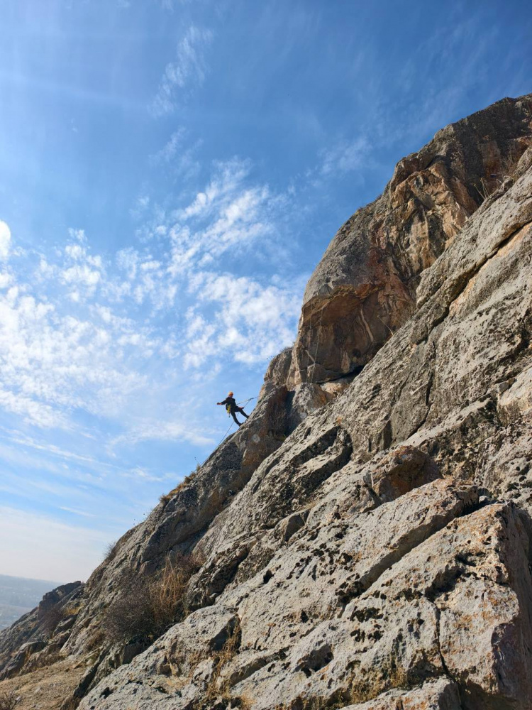 На горе Керме-Тоо опытные альпинисты проводят очистку скального массива и размечают дистанции для предстоящих соревнований. Работы организованы Федерацией спортивного туризма при технической поддержке РДЮЦЭКТ при Министерстве просвещения, центра подготовки промышленных альпинистов "Вершина" и РОСО МЧС по городу Ошу.