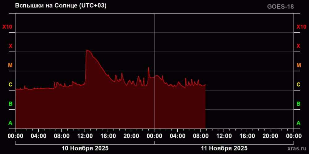 Высшей уровень вспышки класса Х зафиксировали 10 ноября в 12:19 мск. За день до этого, 9 ноября, в РАН сообщили о вспышке мощностью Х1.79. После нее Солнце выбросило значительный объем плазмы в сторону Земли.