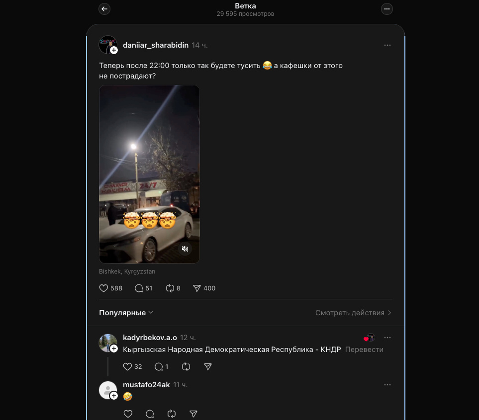 События стали развиваться стремительнее с 13 ноября. Глава Госкомитета национальной безопасности Камчыбек Ташиев заявил, что закон о тишине в Кыргызстане практически не работает. В связи с этим он запретил проведение мероприятий в кафе и ресторанах после 22:00, дав устное поручение местным властям и правоохранительным органам. И те сразу бросились его выполнять.