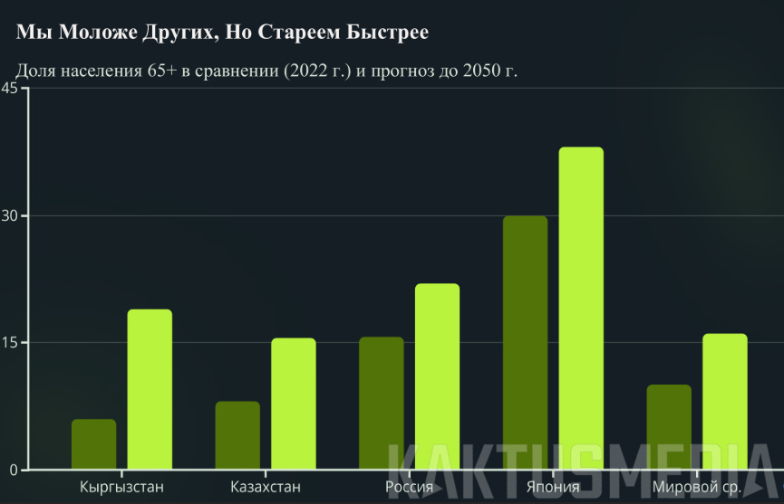 Несмотря на то что Кыргызстан остается относительно молодой страной по сравнению с другими, процесс старения происходит значительно быстрее. Так, с 1999 по 2022 год численность этой возрастной группы выросла на 150%. По прогнозам, к 2050 году доля населения старше 65 лет утроится.