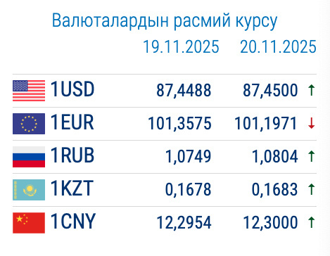 Стоимость доллара теперь 87,50, евро 101,1 сома, рубль по 1,8 сома.
