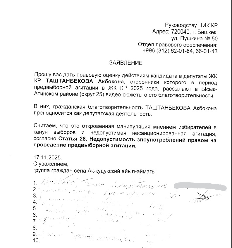 Также в Центризбирком поступила коллективная жалоба от жителей села Ак-Кудук Нарынского района Нарынской области с просьбой дать правовую оценку действиям агитаторов кандидата в депутаты ЖК КР по избирательному округу №25 Акбокона Таштанбекова, которые распространяют в Ысык-Атинском районе видеоматериалы о его благотворительной деятельности.