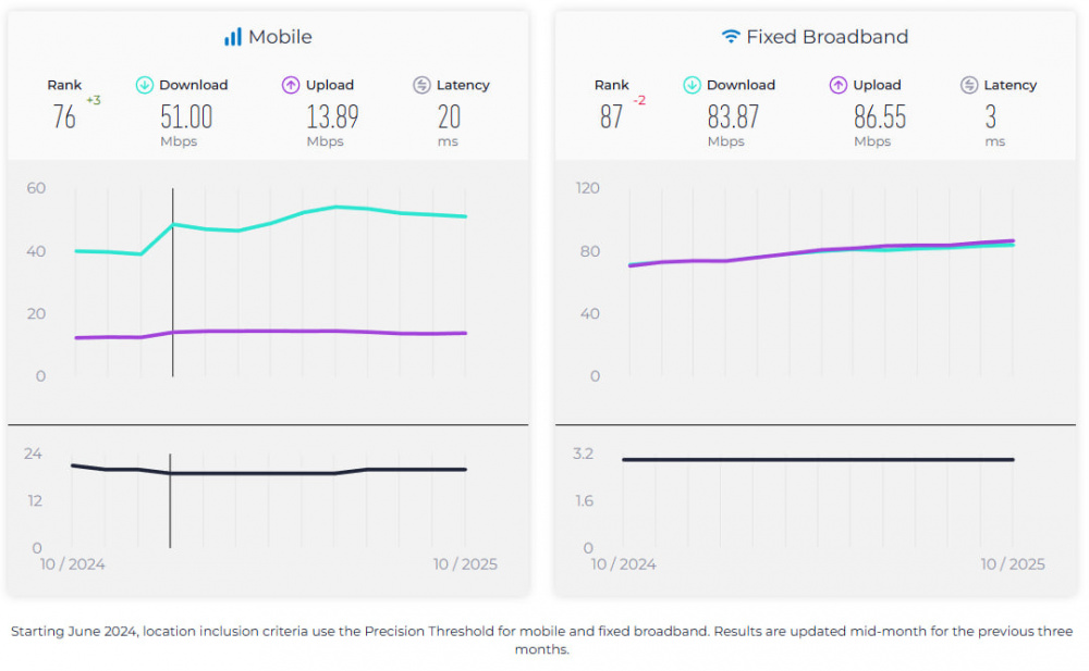 По сравнению с январем страна потеряла шесть позиций. Однако тогда средний показатель загрузки был ниже и составлял 48,42 Мбит/с, скорость отдачи - 14,21 Мбит/с и задержка соединения - 19 мс.