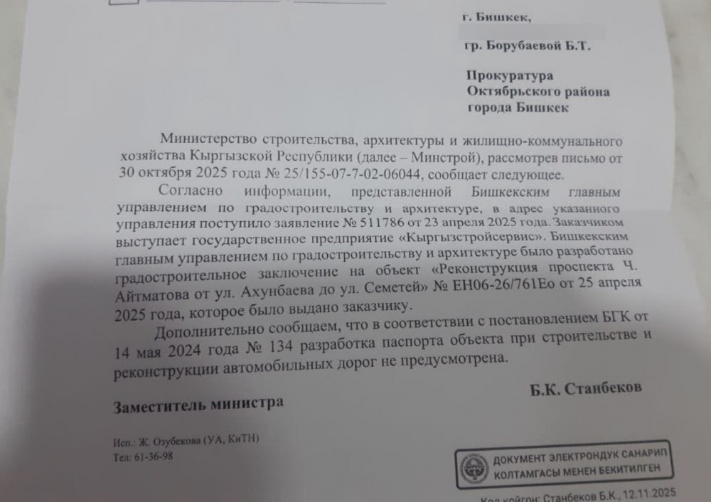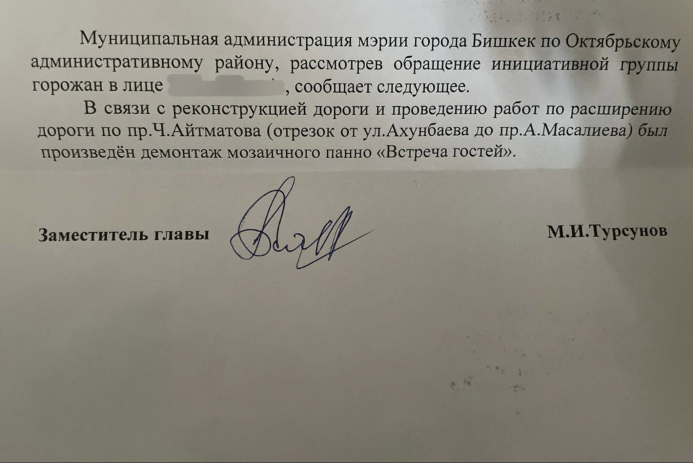 Чтобы выяснить, был ли демонтаж мозаики изначально заложен в проект реконструкции проспекта, активисты обратились в Минкультуры КР, в "Кыргызстройсервис" и в Бишкекское главное управление по градостроительству и архитектуре, а также написали в прокуратуру Октябрьского района.