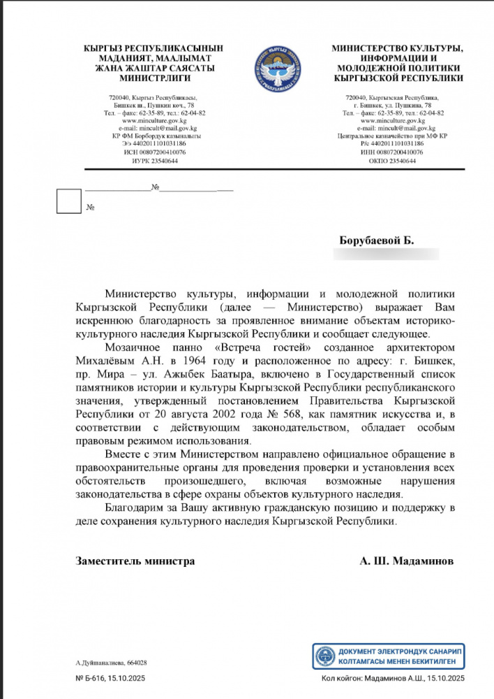Министерство культуры, информации и молодежной политики КР обратилось в правоохранительные органы в связи со сносом памятника истории и культуры КР - мозаичного панно "Встреча гостей". Это следует из официального ответа ведомства от 15 октября 2025 года, сообщают активисты городской инициативы по улучшению качества воздуха в Бишкеке "БишкекСмог".