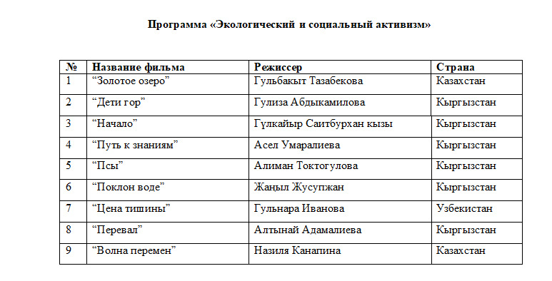 В главном корпусе ОшГУ состоится презентация исследовательской программы Общественного фонда творческих женщин Азии. Затем актриса Жанылай Исакова проведет мастер-класс по актерскому мастерству. Кинофорум завершится торжественной церемонией закрытия, на которой жюри вручит призы и дипломы за I, II и III места по итогам программ "Женский объектив" и "Экологический и социальный активизм".