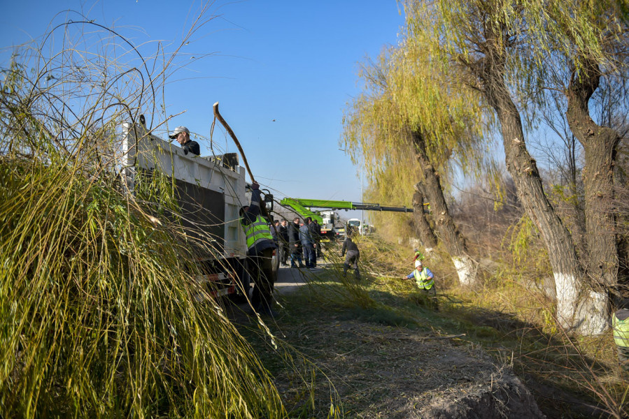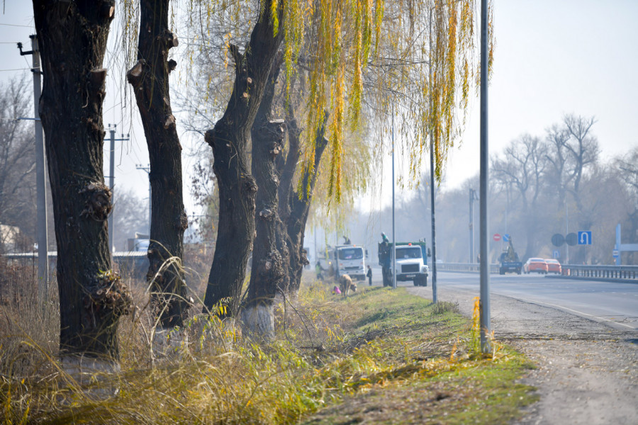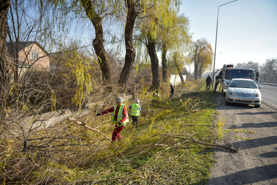 Работники муниципальных предприятий "Бишкекзеленстрой" и "Тазалык" подрезают ветви, поднимают кроны деревьев, а также скашивают камыши и дикий травяной покров