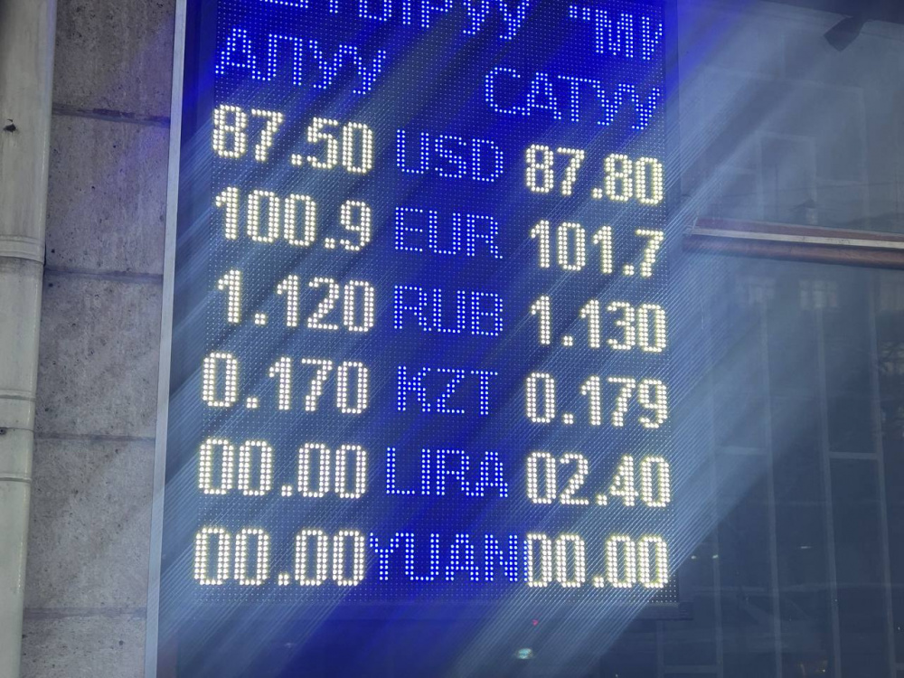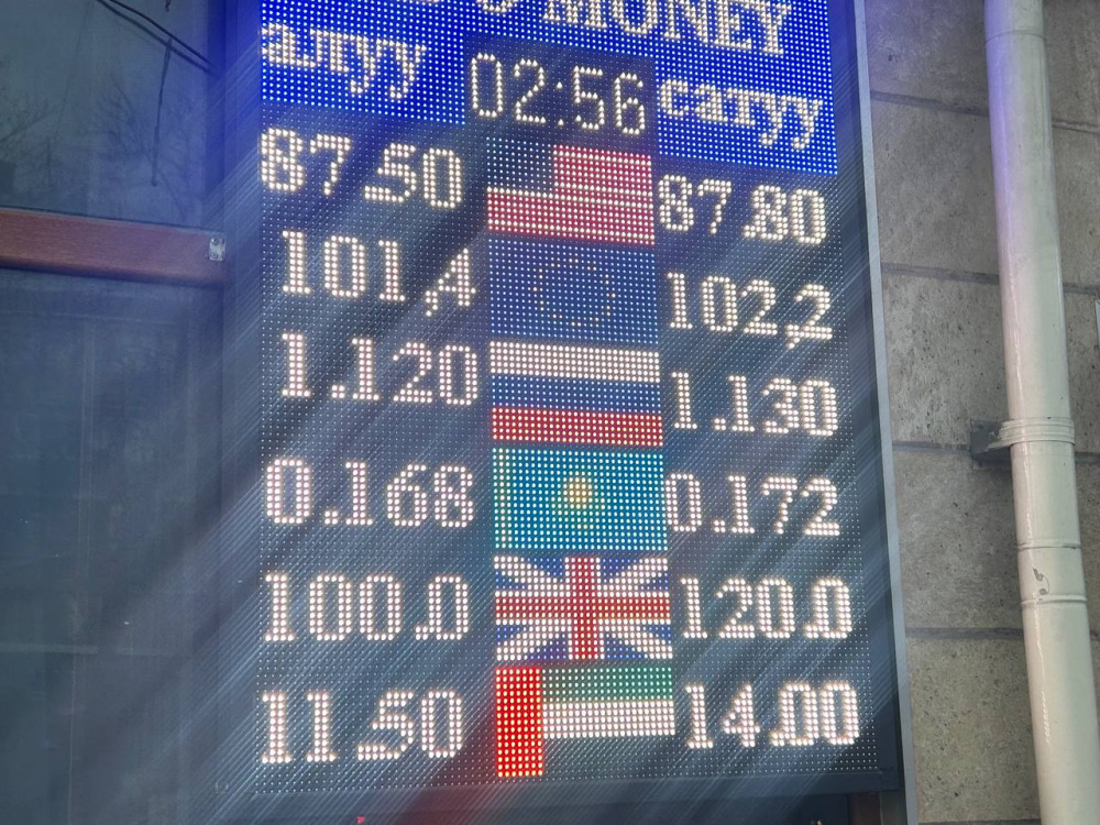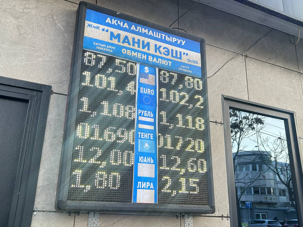 Рубль подешевел. Цена его покупки - 1,10-1,12 сома, продажи - 1,12-1,13.