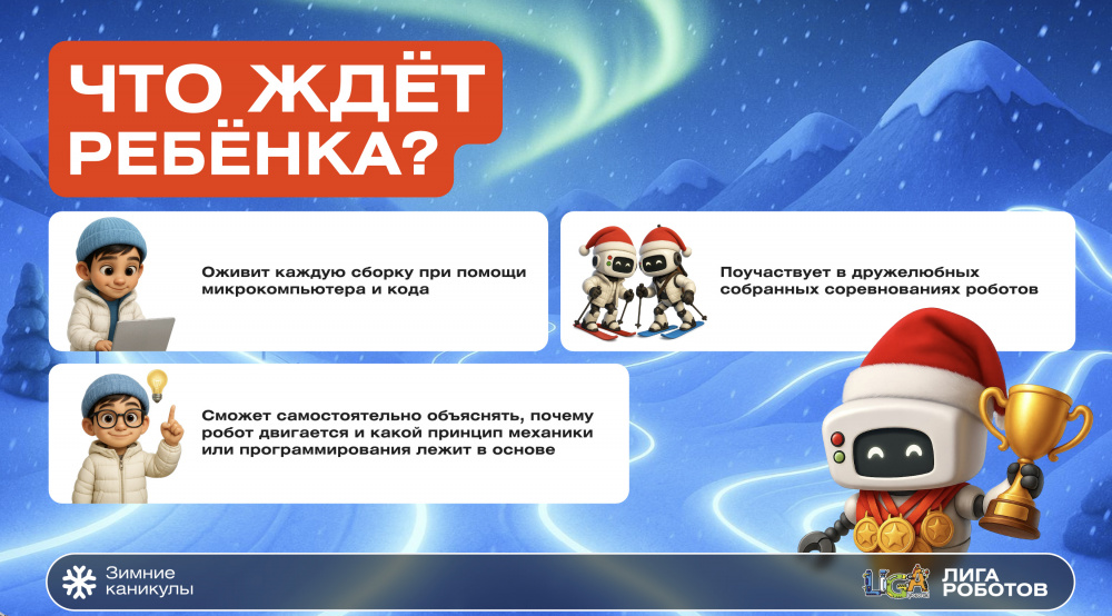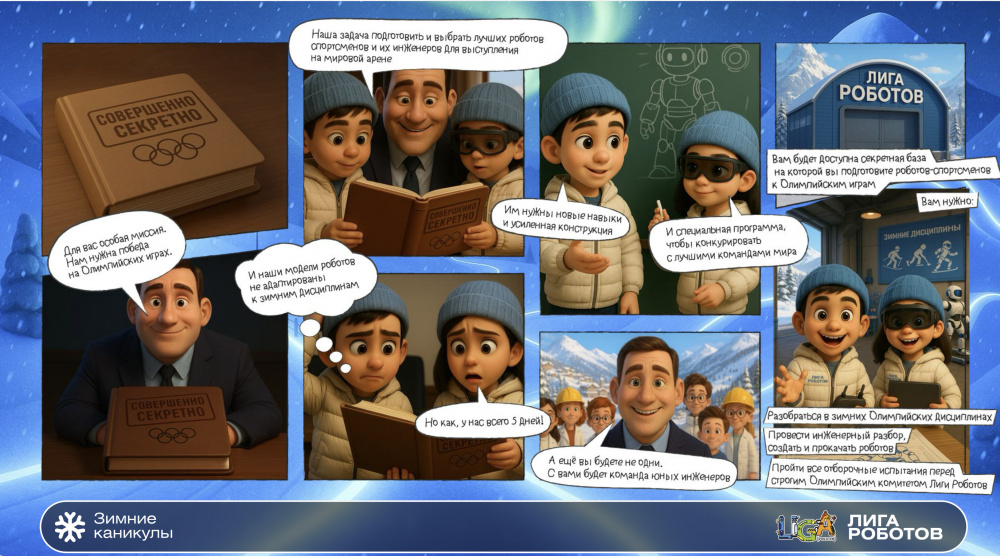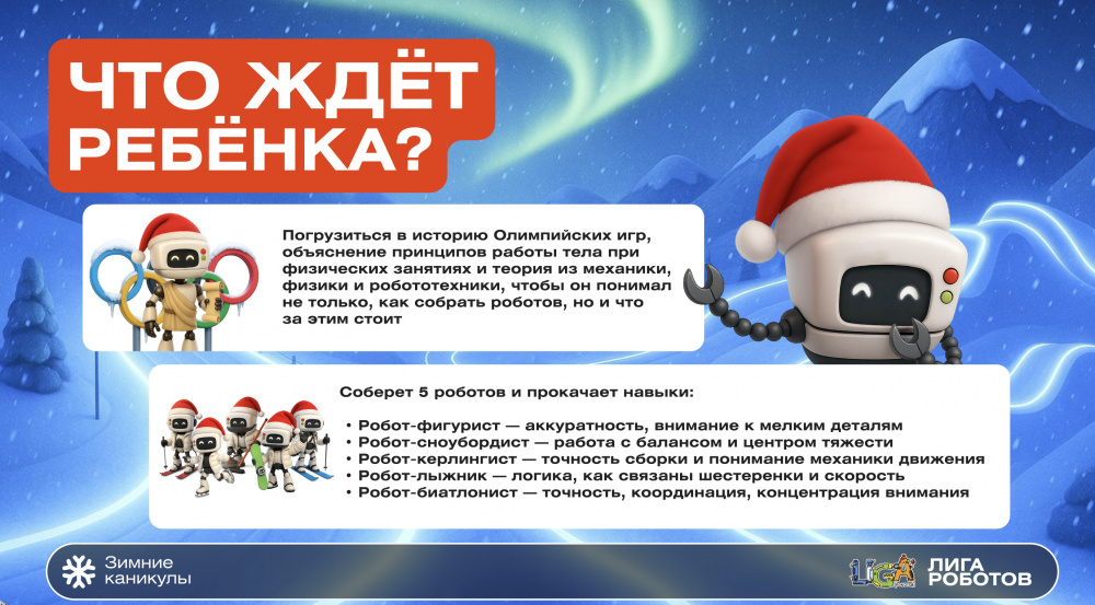 "Лига роботов" представляет оригинальный зимний интенсив - Олимпийские игры - 2026. Этой зимой ребенок может стать частью уникального проекта: секретная инженерная база "Лиги роботов" готовит своих роботов-спортсменов к зимним Олимпийским играм - 2026.