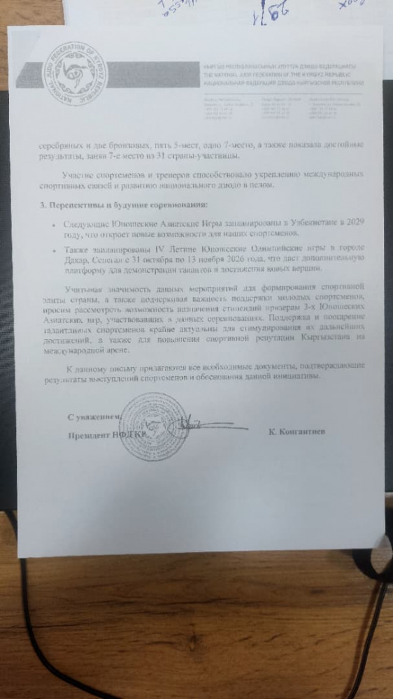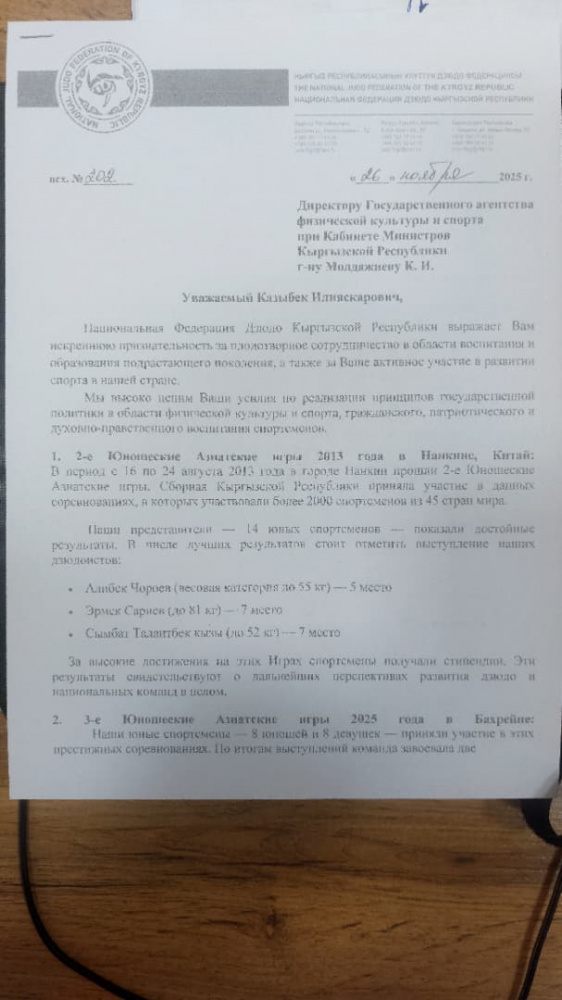 Несколько спортивных федераций (федерации джиу-джитсу, дзюдо, пенчак силат, борьбы) обратились в Государственное агентство по делам молодежи, физической культуре и спорту, а точнее, к его руководителю Кыязбеку Молдажиеву с просьбой рассмотреть назначение государственных стипендий спортсменам, показавшим высокие результаты на юношеских Азиатских играх.