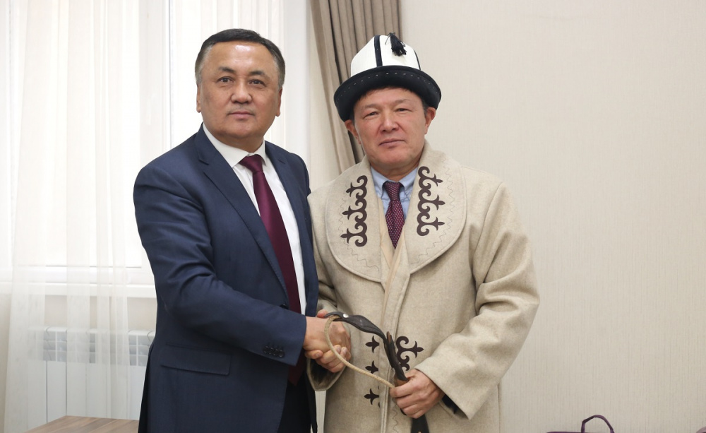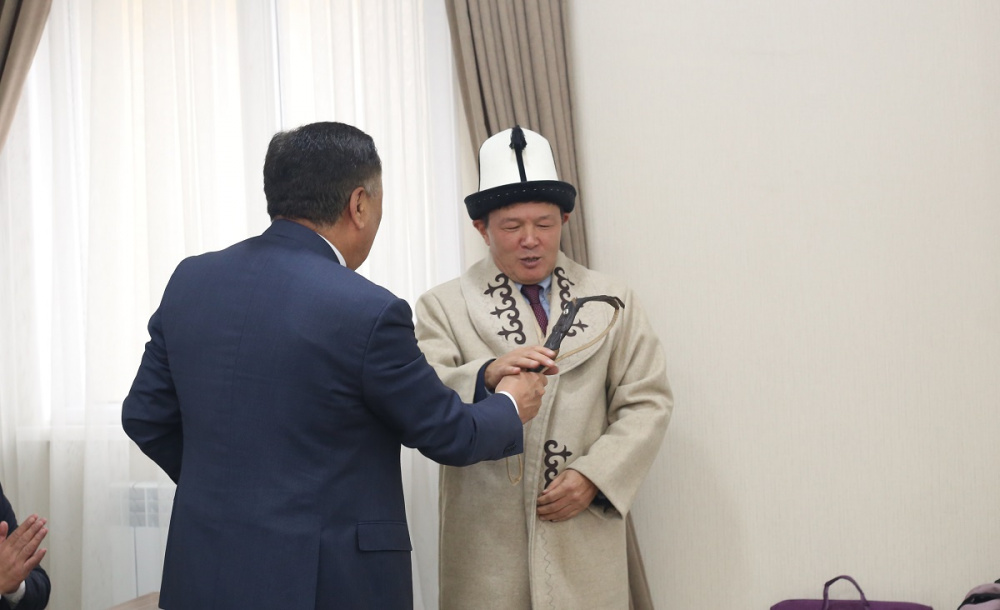 Новоизбранный президент федерации торжественно проводил Аманкулова и в знак уважения надел на него ак калпак и чепкен.