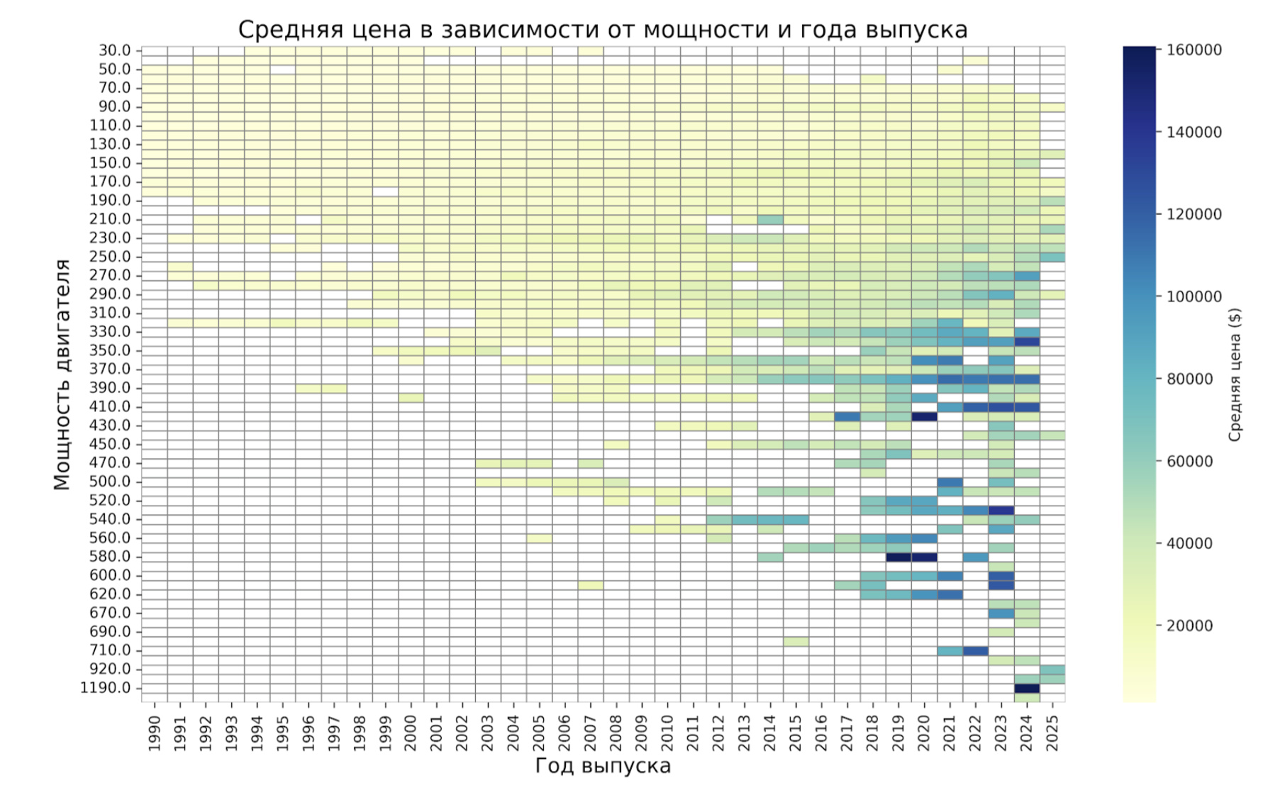 Главный вывод подтверждает общемировой тренд: чем новее автомобиль и чем выше его мощность, тем выше его средняя рыночная стоимость. Однако детальное изучение тепловой карты позволяет выявить нюансы, критически важные для участников рынка.