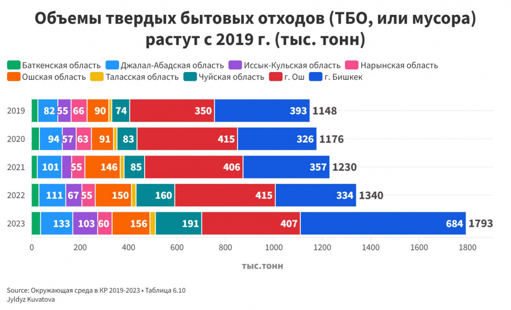 Официальная статистика за 2023 год сообщает, что в Кыргызстане не зарегистрировано отходов первого класса опасности – тех самых, которые считаются чрезвычайно опасными и наносят необратимый вред человеку и экосистемам. На бумаге это выглядит утешительно, но на практике означает, скорее, пробел в учете, а не реальное отсутствие ртути, батареек или части медицинских отходов, которые попадают в общий поток мусора и теряются среди бытовых отходов. При этом по отходам второго класса опасности, которые также требуют особой утилизации и способны накапливаться в природе, особое внимание заслуживают Чуйская и Иссык‑Кульская области, где такие вещества постепенно оседают в почве и воде, оставаясь невидимыми для горожан.