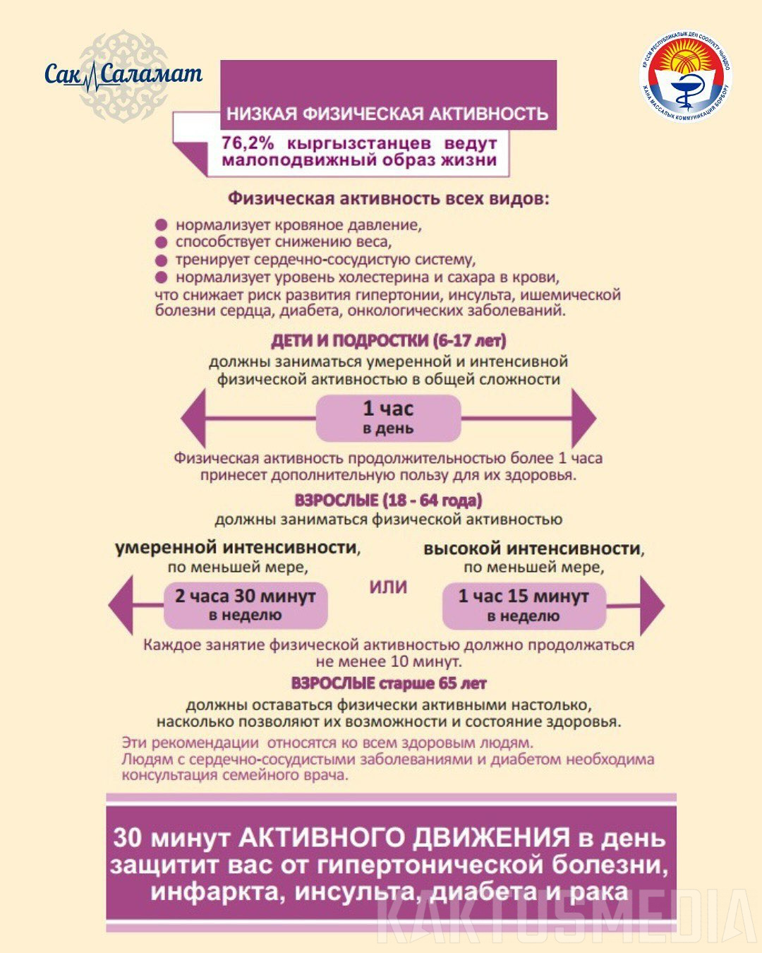 По данным центра, 76,2% кыргызстанцев ведут малоподвижный образ жизни.