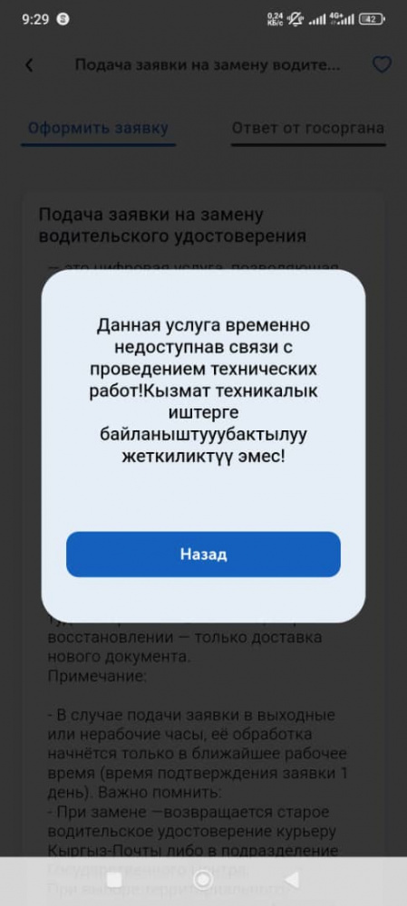 "В связи с модернизацией услуги по замене водительских удостоверений и расширением ее функционала (в том числе добавлением бесплатной замены) услуга временно недоступна. Услуга будет доступна после выхода ближайшего обновления мобильного приложения "Тундук", - отметили в компании.