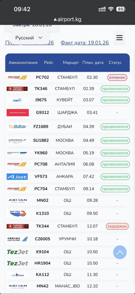 Сегодня, 19 января, в международном аэропорту "Манас" вновь возникли задержки приема и отправки авиарейсов, возможно, связанные с низкой видимостью из-за тумана. Информацию об этом подтвердили в ОАО "Аэропорты Кыргызстана".