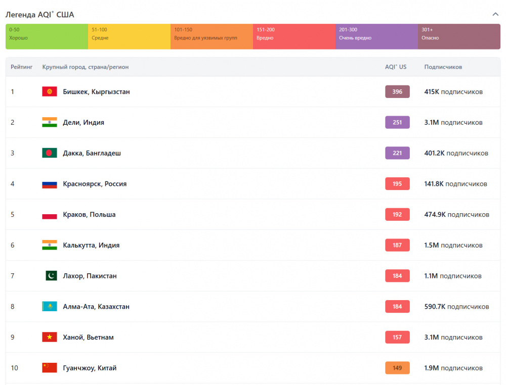 Согласно мониторингу, индекс качества воздуха (AQI) в столице составил 396, что соответствует уровню "опасно".