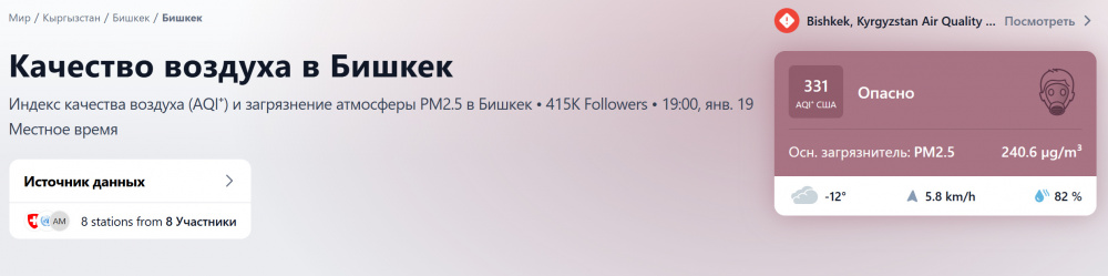Также отмечается, что концентрация мелкодисперсных частиц PM2.5 в Бишкеке в 48,1 раза превышает рекомендуемое Всемирной организацией здравоохранения среднегодовое значение нормы. По состоянию на 19:00 статус города сохранялся как "опасно".