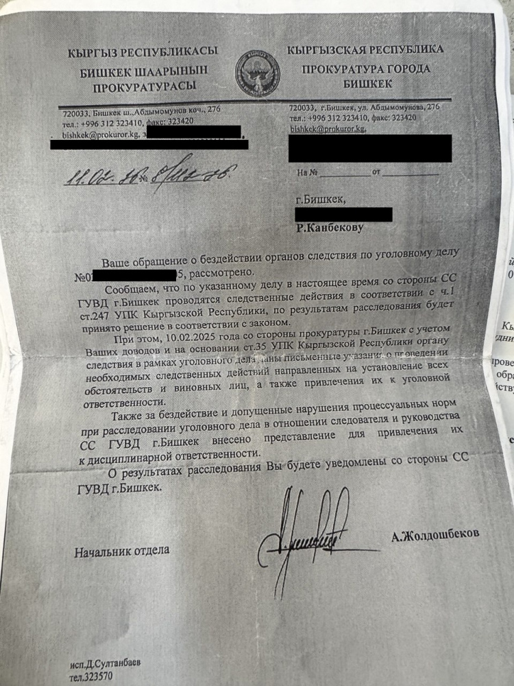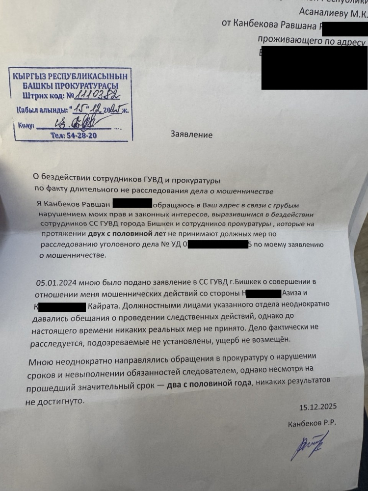 "В декабре 2025 года я в пятый раз написал заявление в Генпрокуратуру КР на сотрудников следствия и прокуратуры. Заявление приняли и отправили в город, а они по цепочке в район. Соответственно, дело опять попало в РУВД Ленинского района. И никаких действий со стороны следственной службы по-прежнему нет", - сообщил Канбеков.