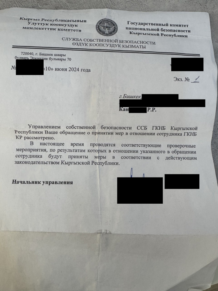 Потерпевший подчеркнул, что лишь спустя время понял, что Кайрат является сотрудником Государственного комитета нацбезопасности Кыргызстана. Поэтому он обратился с заявлением в ГКНБ. Также он просил встречи с генералом Камчыбеком Ташиевым, но встретиться с ним Канбекову не удалось. Однако в ГКНБ ему ответили, что обязательно примут меры в отношении своего сотрудника.