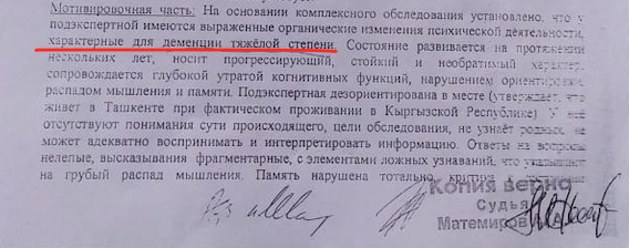 87-летняя Светлана Прокофьева страдает деменцией при болезни Альцгеймера. Семья женщины утверждает, что из-за своего диагноза она стала жертвой мошеннической схемы, бездействия правоохранительных органов и противоречивых судебных решений. Ее зять (муж ее внучки) Андрей Сторожев обратился к президенту Садыру Жапарову и председателю ГКНБ Камчыбеку Ташиеву с просьбой взять под личный контроль ситуацию, из-за которой Прокофьева лишилась недвижимости.