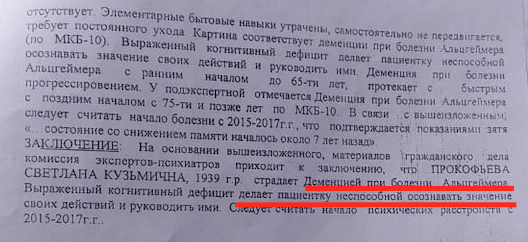 Началась судебная тяжба, которая длится уже пятый год. За это время женщина дважды проходила судебно-психиатрическую экспертизу. В 2024 году ей официально диагностировали деменцию при болезни Альцгеймера. В 2025 году при повторной экспертизе этот же диагноз подтвердили другие врачи.