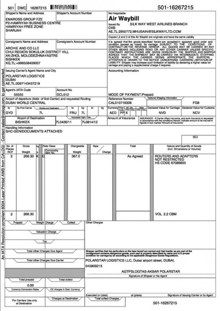 Расследователи также обратили внимание на данные авианакладной: перевозчиком груза указана компания Polarstar Logistics, которая была включена в санкционные списки США в феврале 2024 года - за два месяца до отправки груза в Бишкек.