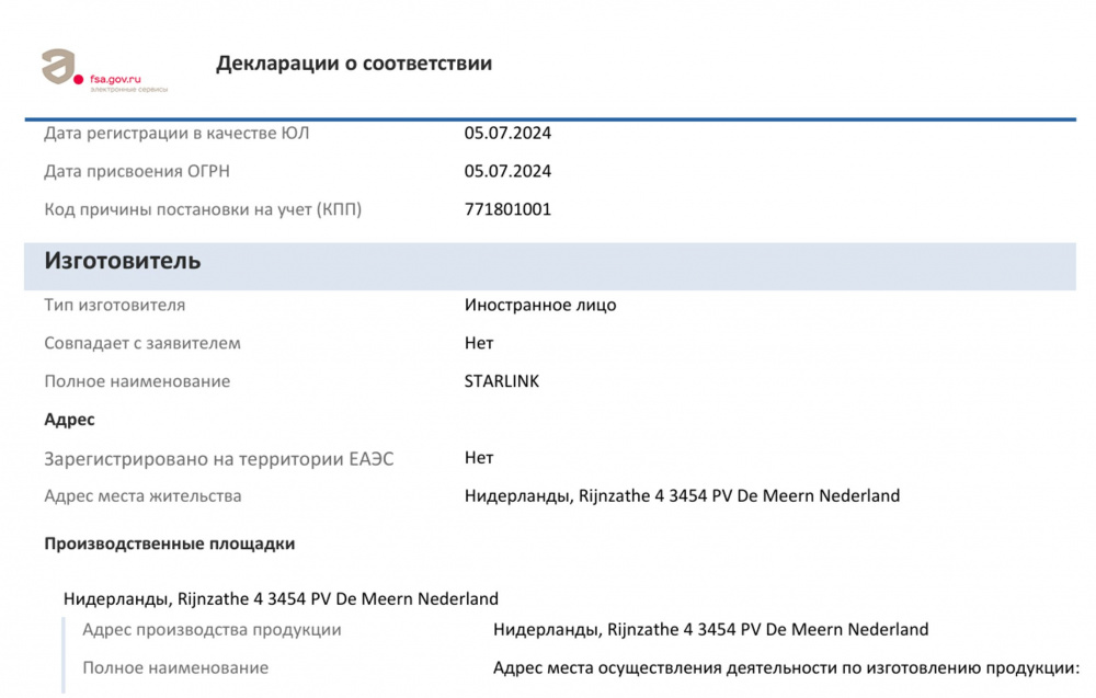 При этом часть таких устройств, по данным расследователей, появилась в российских базах данных по соответствию техническим регламентам. В одних декларациях производителем указан SpaceX, в других - сторонние компании, а иногда данные о производителе вообще отсутствуют.