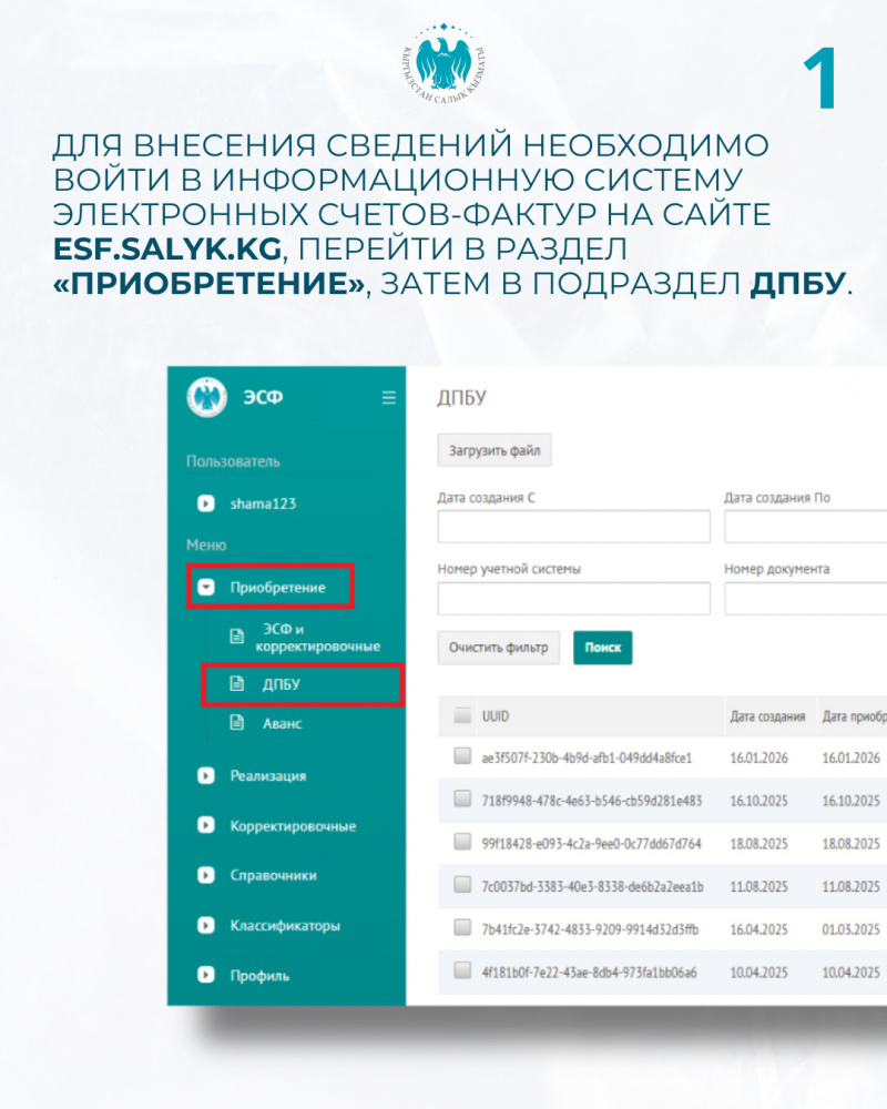 • Для внесения сведений необходимо войти в информационную систему электронных счетов-фактур на сайте esf.salyk.kg, перейти в раздел "Приобретение", затем в подраздел ДПБУ.